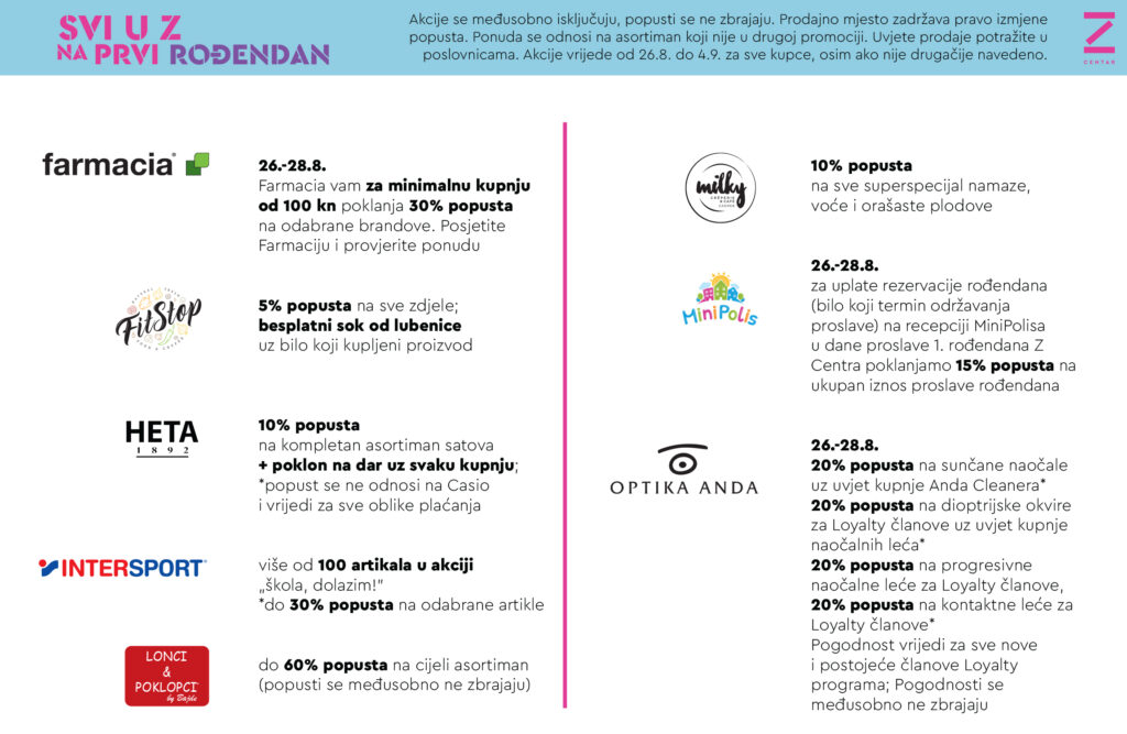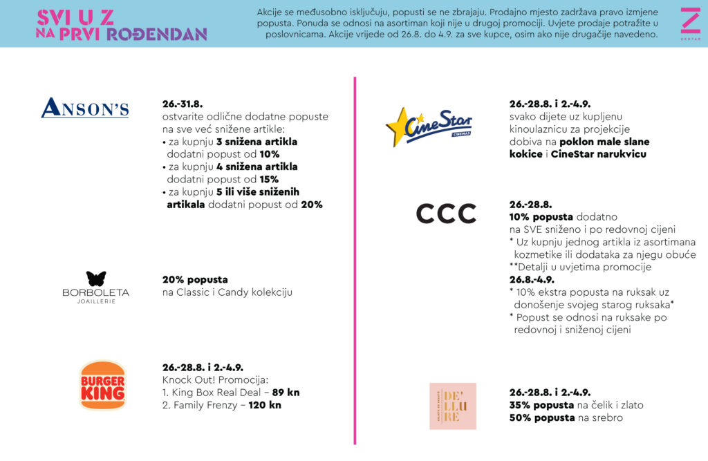 Prvi vikend od 26.8. do 28.8. pripremili smo zabavan program uz DJ-a, dječji zabavni park, facepainting, eko radionice za djecu, dječje predstave i predstavu Kazališta Kerekesh. Zabavni program proteže se kroz cijeli centra, na više lokacija, na trgu, u hodniku Objekta Sjever, na prizemlju te već tradicionalno dječje predstave na našem food courtu.